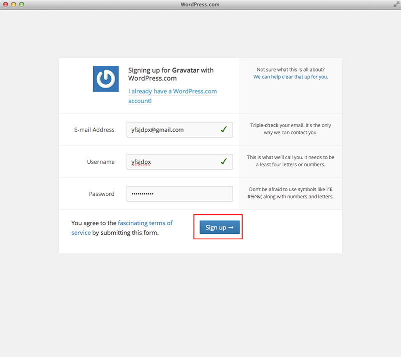 输入你常用的邮箱地址(注意,Gravatar是通过邮箱识别头像的,也就是把头像和邮箱相关联,要想在博客站点中显示头像,你需要将你注册博客的邮箱和注册Gravatar的邮箱设置成同一个)点击绿色按钮继续。