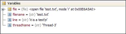 对于多线程程序来说,通常会有多个线程,当需要 debug 的断点分别设置在不同线程对应的线程体中的时候,通常需要 IDE 有良好的多线程调试功能的支持。 Pycharm 中在主线程启动子线程的时候会自动产生一个 Dummy 开头的名字的虚拟线程,每一个 frame 对应各自的调试帧。如图 5,本实例中一共有四个线程,其中主线程生成了三个线程,分别为 Dummy-4,Dummy-5,Dummy-6. 其中 Dummy-4 对应线程 1,其余分别对应线程 2 和线程 3。